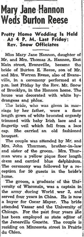 Reese in her parent’s house in July 1948. Their attendants were Mr. and Mrs. John